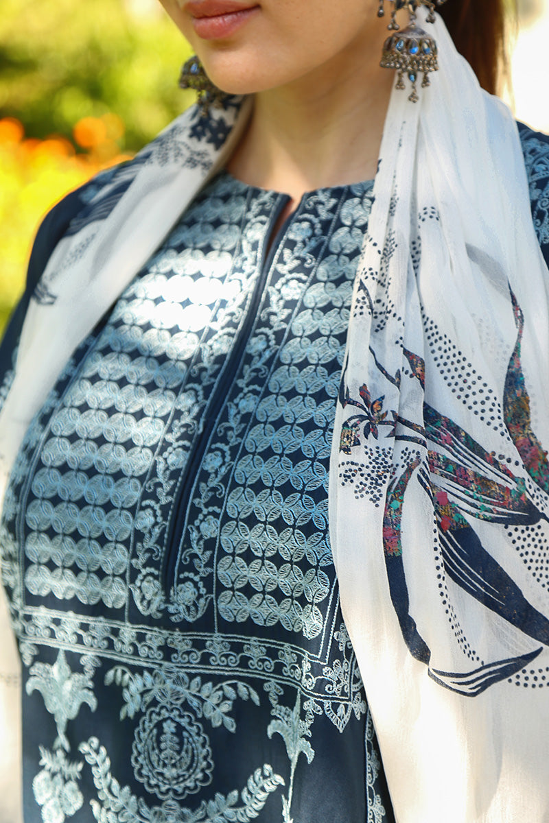 Elevate your style with our embroidered 3-piece ensemble, beautifully complemented by a contrasting chiffon printed dupatta. This outfit perfectly blends intricate embroidery with vibrant prints, offering a sophisticated and eye-catching look. Ideal for making a statement.