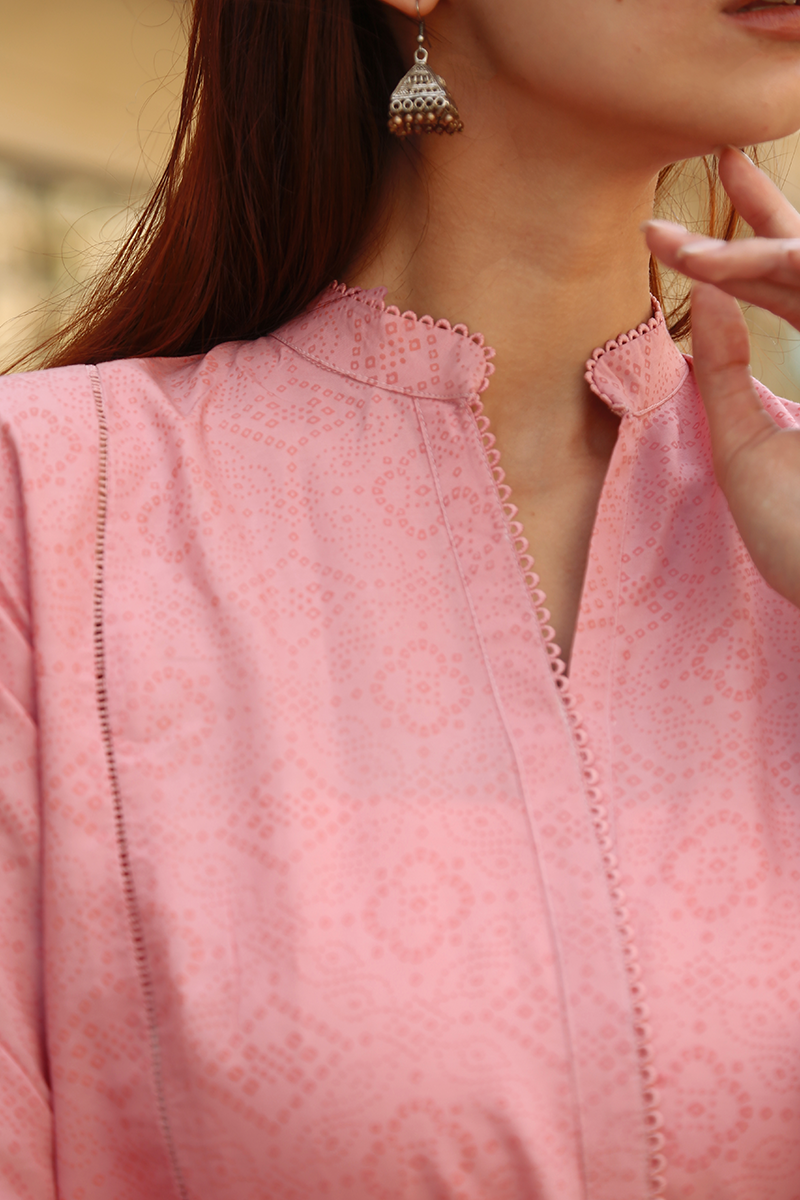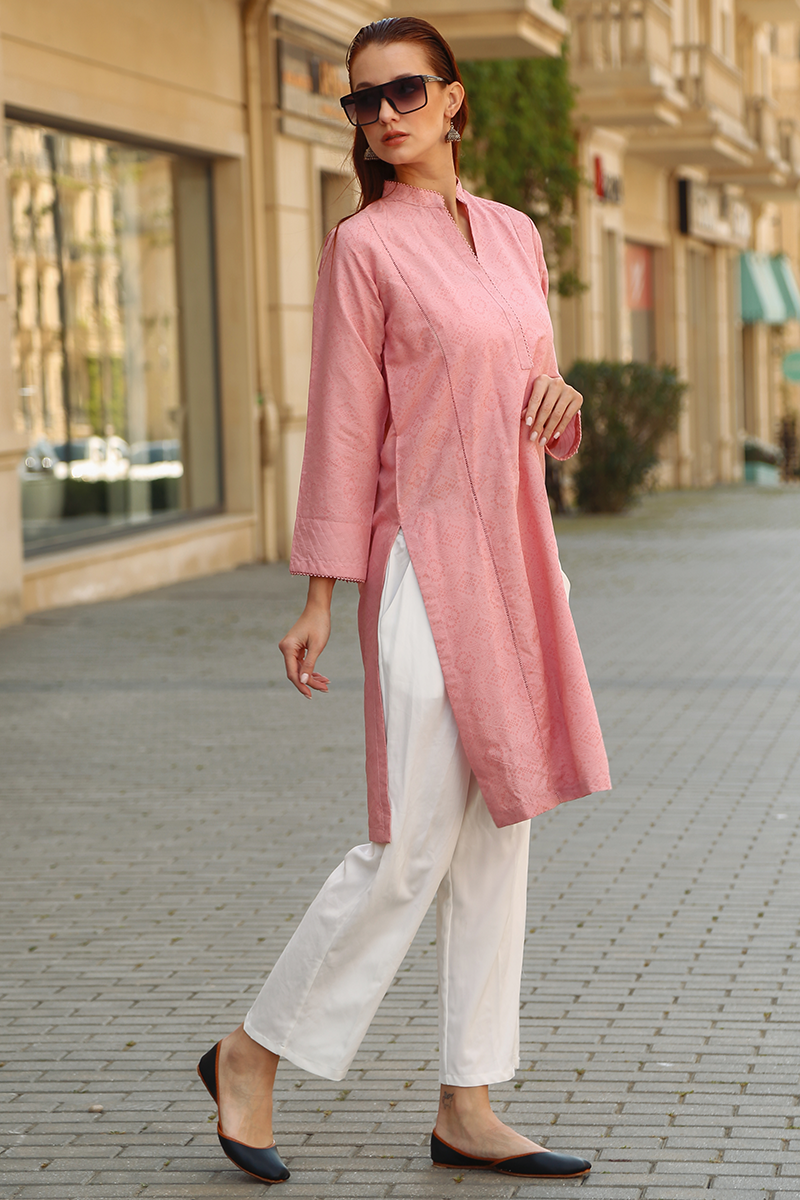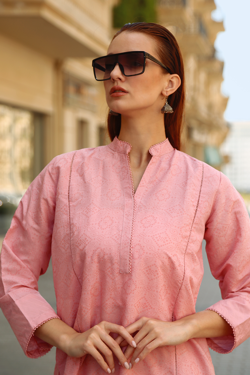 Step into elegance with our Petal Pink collection. This ensemble features a hand-printed monotone shirt, adorned with intricate stitching details, paired with classic straight trousers. The soft pink hue exudes sophistication and charm, perfect for a chic, effortless look.